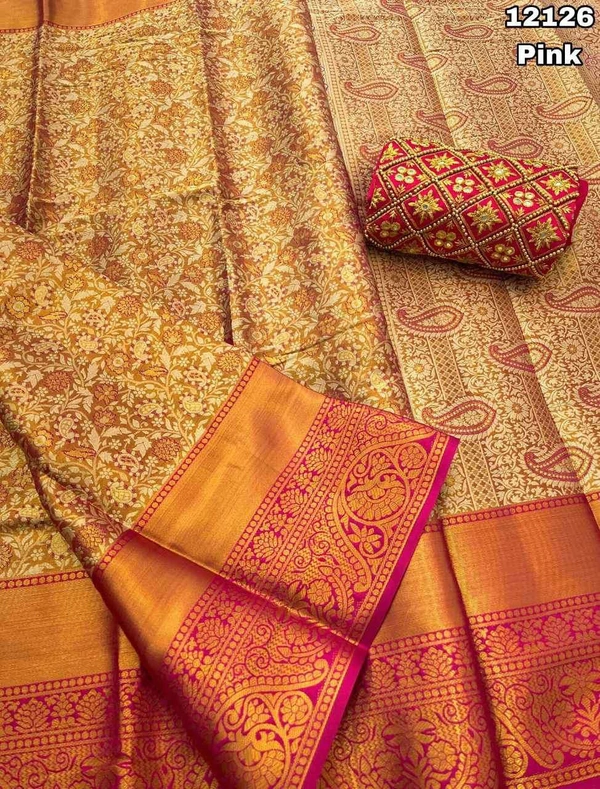Kanjivaram Golden Zari Weaving Saree With Work Blouse Combo